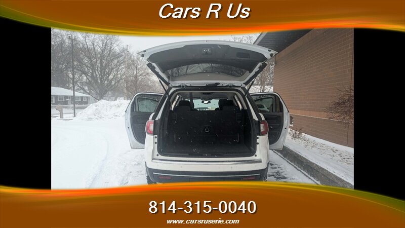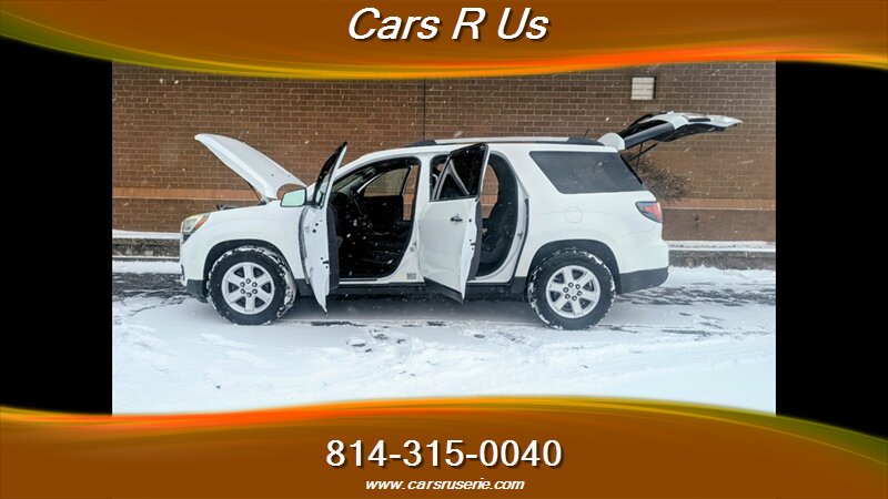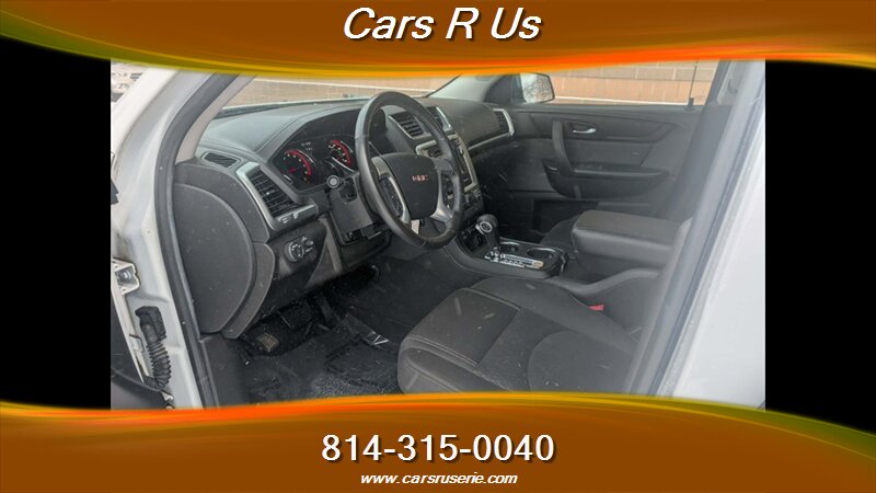 2016 GMC Acadia SLE-2 powered by a 3.6L V6 (281 hp, 266 ft-lbs) with a six-speed automatic, finished in White Frost Tricoat with an Ebony interior; EPA-rated at 15 MPG city and 22 MPG highway. Factory-standard equipment includes seating for up to seven with a third row, cloth upholstery in Ebony, power windows and door locks, remote/keyless entry, cruise control, steering-wheel audio controls, Bluetooth hands-free phone and audio streaming with USB/AUX inputs, a rearview camera, ABS with traction/stability control, full airbag system, alloy wheels, and OnStar/connected services with trial subscription.