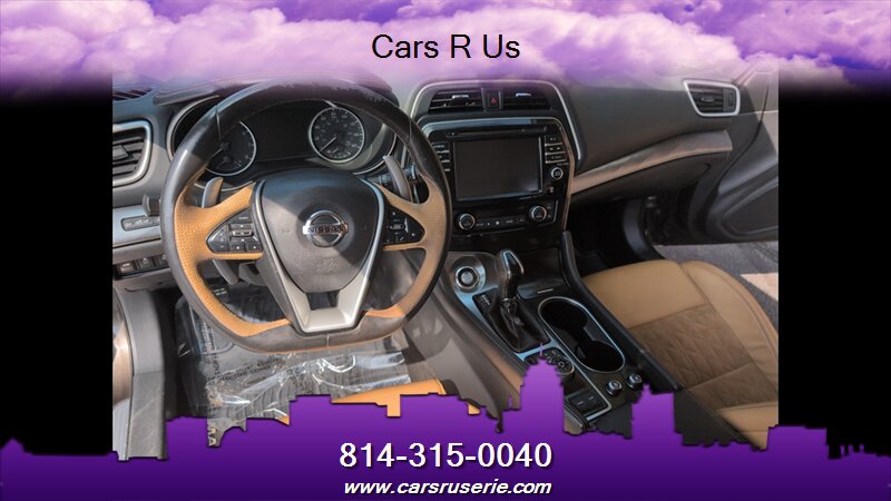 The 2016 Nissan Maxima 3.5 SR comes equipped with a powerful 3.5L V6 engine producing 300hp and 261ft. lbs. of torque. This model boasts a sleek Forged Bronze exterior color complemented by a Camel interior. Standard factory features include keyless entry, push-button start, dual-zone automatic climate control, an 8-inch touchscreen infotainment system with navigation, Bluetooth connectivity, a rearview camera, leather-appointed seats, heated front seats, and a premium Bose sound system. With an impressive fuel efficiency of 22 MPG in the city and 30 MPG on the highway, the Maxima 3.5 SR offers a balance of performance and comfort for drivers seeking a refined driving experience.